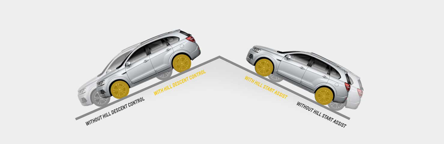 Hill Descent Control (HDC) memungkinkan mesin dan rem untuk berfungsi bersamaan untuk kendali lebih saat melalui turunan. Hill Start Assist (HSA) berfungsi mencegah kendaraan meluncur mundur saat menanjak, memastikan agar Anda tidak menabrak apapun di belakang