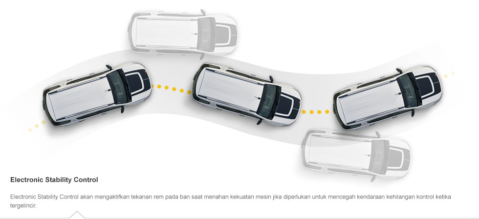 Electronic Stability Control –berguna untuk mengaktifkan rem pada ban saat menahan kekuatan mesin pada kendaraan untuk mencegah kehilangan control kendaraan saat tergelincir