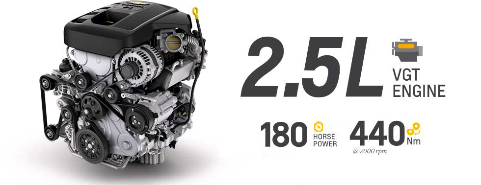 Menggunakan mesin 2500cc Duramax with B20 – Menghasilkan tenaga sampai 180 HP dan torsi terbesar di kelasnya sampai 440 NM